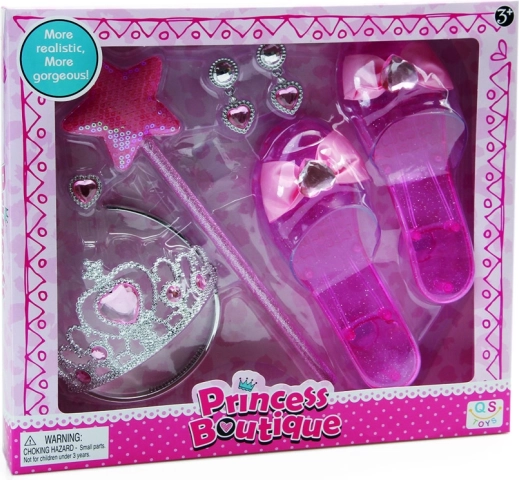 - Include coroană cu diademă, pantofiori eleganți, cercei, inel și baghetă magică.