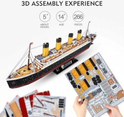 Bucură-te de asamblarea detaliată a legendarului vapor cu aburi TITANIC. Puzzle-ul 3D cu 266 de piese de la CubicFun oferă detalii realiste și o atmosferă accentuată de iluminarea LED integrată. Piesele sunt realizate din spumă de aproximativ 3 mm grosime, acoperită cu hârtie laminată imprimată – durabile, bine ajustate și plăcute la asamblat.