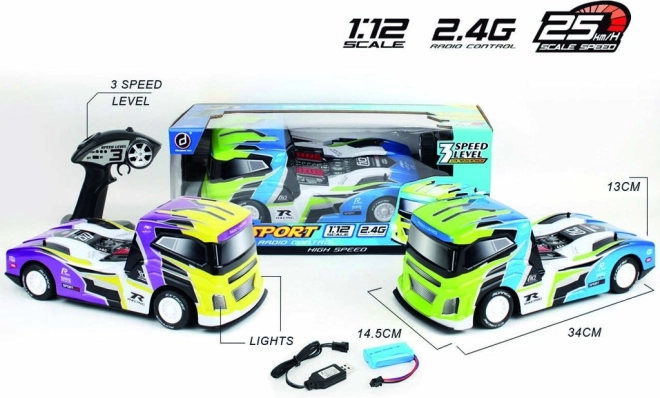 Cap tractor R/C de curse la scară 1:12 oferă trei moduri de viteză de până la 25 km/h, faruri LED frontale, amortizoare de absorbție pe ambele axe și un aspect realist. Control stabil pe 2,4 GHz, încărcare USB și tot ce este necesar pentru a porni la drum în pachet – trebuie doar să achiziționați baterii pentru telecomandă.