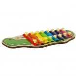 Xilofonul este realizat dintr-o combinație de lemn și metal. Este suficientă o atingere ușoară cu bagheta pe lamelă pentru a obține un ton curat, a cărui intensitate depinde de forța loviturii. Culorile vii și calde invită la joacă și sunt excelente și pentru învățarea culorilor.