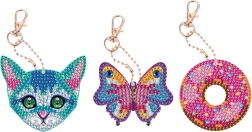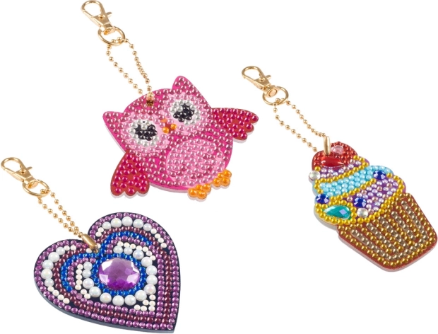 Acest set îți permite să creezi trei brelocuri diferite în formă de bufniță, înghețată și inimă. Fiecare breloc este decorat cu pietricele colorate care adaugă stil personalizat cheilor tale.