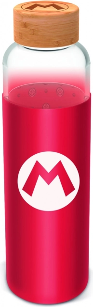 Sticlă stilată din sticlă, cu volum de 585 ml și husă din silicon cu motivul SUPER MARIO, ideală pentru călătorii, școală și serviciu. Sticlă borosilicată rezistentă, înveliș antiderapant practic și ambalaj cadou care îi va încânta pe fani și ca dar original.