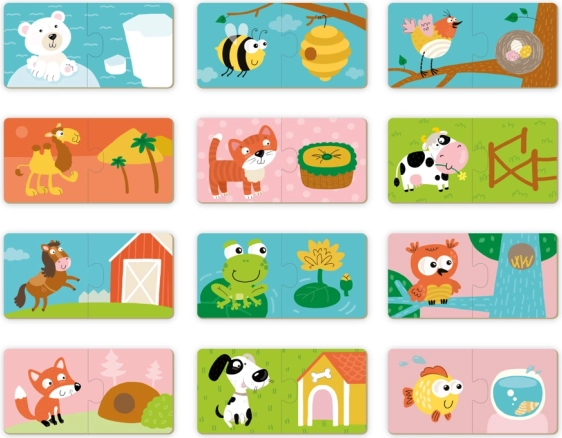 Descoperiți primele puzzle-uri pentru cei mici: setul include 12 perechi în care copiii potrivesc animăluțul cu locuința sa. Piesele mari și solide cu grosime de aprox. 3 mm facilitează prinderea și asamblarea și susțin motricitatea fină și gândirea logică.