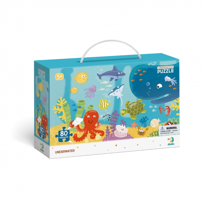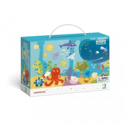 Puzzle distractiv pentru copii cu tematica mării, care oferă nu doar asamblare, ci și un joc de căutare. După ce îl asamblați, găsiți în imagine toate animalele marine. Ilustrații colorate, 80 de piese și dezvoltarea vocabularului, memoriei și concentrării fac din acest joc o alegere ideală pentru copiii de la 5 ani în sus.