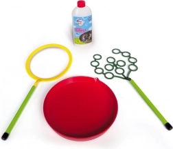 În pachet găsiți două inele – unul pentru bule uriașe și altul pentru o mulțime de bule mici, plus un bol roșu pentru înmuiere ușoară și o reîncărcare de 0,5 l. Ideal pentru după-amieze în familie, petreceri și jocuri în aer liber.