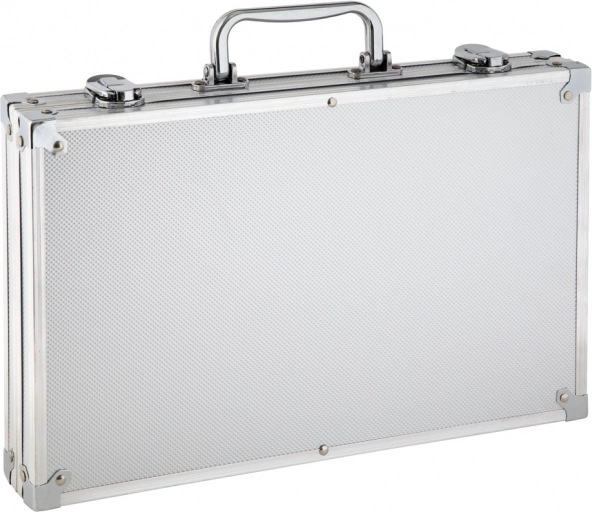 Această geantă metalică este echipată cu un mâner solid și catarame sigure, permițând transportul facil și organizarea în siguranță a tuturor materialelor.