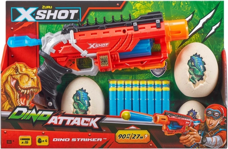 X-Shot Dino Striker din colecția Dino Attack combină un design atrăgător cu dinozauri și un mecanism de operare simplu. Doar armezi, țintești și tragi – ideal pentru antrenamentul de precizie și dueluri palpitante cu prietenii.