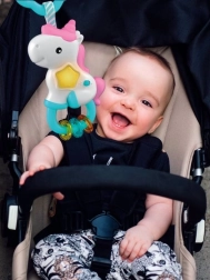 O zornăitoare interactivă colorată și foarte moale, în formă de unicorn, îi va încânta pe cei mici cu efecte sonore și melodii și cu o luminiță clipitoare. Datorită inelului și buclei pentru agățare o fixezi ușor pe pătuț, cărucior sau scaunul auto. Inelele zornăitoare și detaliile foșnitoare susțin motricitatea fină și percepția vizuală și auditivă. Bateriile sunt incluse în pachet (demo).