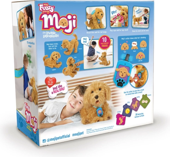 Moji este un cățeluș interactiv, îmbrățișabil, cu blană moale și expresie adorabilă, care cucerește rapid inimile copiilor. Datorită senzorilor avansați și zgărzii inteligente cu ecran, reacționează realist la mediul înconjurător, învață comenzi și își comunică nevoile și starea de spirit.