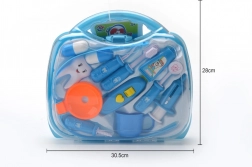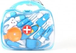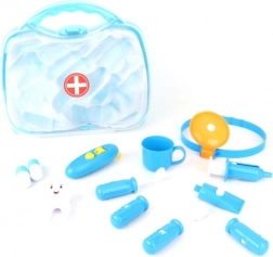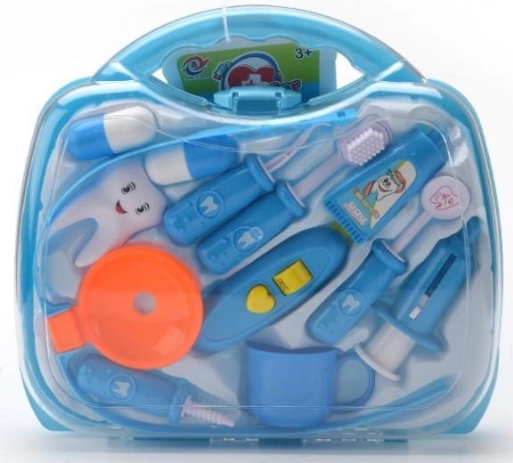 Valiza albastră transparentă ascunde diverse accesorii dentare, inclusiv o periuță, „pastă” și un model de dinți. Perfectă pentru exersarea obiceiurilor de igienă și pentru jocuri creative de-a dentistul.