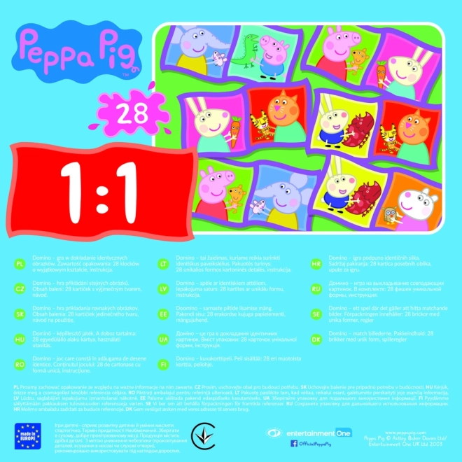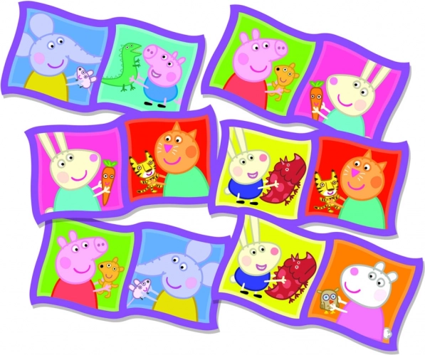 Domino Peppa Pig este un joc distractiv și educativ pentru copii, care dezvoltă memoria, capacitatea de recunoaștere a tiparelor și gândirea logică. Jucătorii încearcă să potrivească cartonașele cu imagini sau cu același număr de puncte. Câștigă cel care își epuizează primul cartonașele sau închide jocul. Datorită aranjării variabile a cartonașelor, fiecare partidă oferă o experiență nouă.