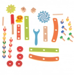 În set sunt incluse șurubelniță și cheie din lemn, astfel încât micii constructori au tot ce le trebuie. Piesele vii coloristic, cu motive jucăușe (de ex. leușor și roți dințate), susțin joaca creativă și învață recunoașterea culorilor. O idee grozavă pentru jucărie educativă și cadou care distrează ore întregi.