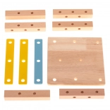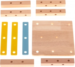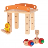 Acest set de calitate din lemn le permite copiilor să asambleze un scăunel de atelier și alte modele originale. Cu ajutorul șuruburilor, piulițelor și rotițelor dințate, copiii explorează principiile mecanicii simple, exersează concentrarea și îndemânarea. Scăunelul este stabil și, datorită sistemului gândit de găuri și îmbinări, oferă numeroase combinații.