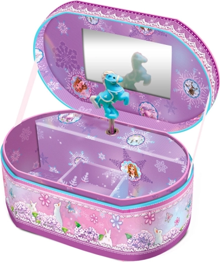 Această cutie muzicală de bijuterii ovală, în stil de basm, aduce farmec și ordine în camera copilului. La ridicarea capacului pornește automat o melodie delicată, creând un moment plăcut la depozitarea inelelor, cerceilor sau a micilor comori.