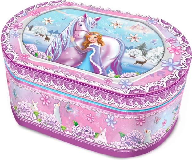 Încântați micuța prințesă cu o cutie de bijuterii elegantă, cu motiv de basm cu cal și prințesă. La deschidere răsună o melodie frumoasă, care însoțește păstrarea micilor comori. Datorită spațiului generos, execuției rezistente și prelucrării sigure, este alegerea ideală pentru primele bijuterii și mărunțișuri ale copiilor.