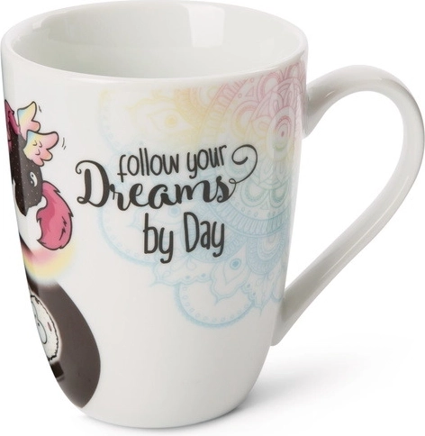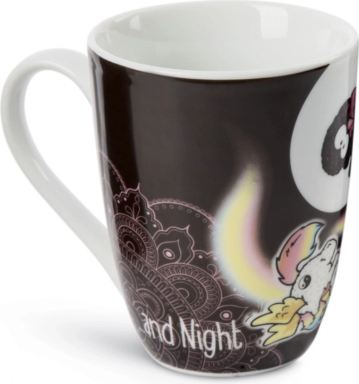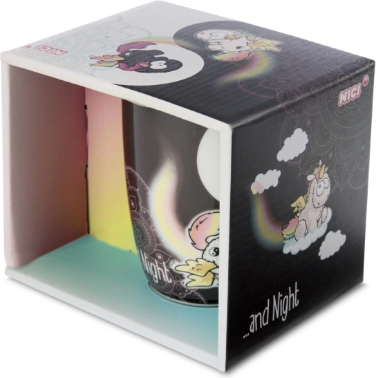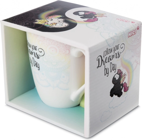 Descoperiți cana fermecătoare NICI cu motivul unicorni Rainbow Yin & Yang, care îmbină stilul minimalist alb-negru cu detalii vesele în culorile curcubeului. Inscripția „Follow your Dreams by day and night” amintește că visele merită atenție oricând pe parcursul zilei.