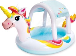 Piscina gonflabilă adorabilă în formă de unicorn aduce copiilor ore întregi de distracție de vară. Datorită pulverizatorului de apă integrat și copertinei colorate, oferă răcorire și umbrire parțială. Fabricată din vinil de calitate, are o capacitate de până la 130 l, dimensiuni de 2,54 × 1,32 × 1,09 m și este potrivită pentru copii de la 2 ani. Include și o plasture de reparare.