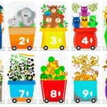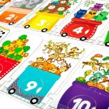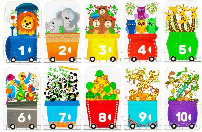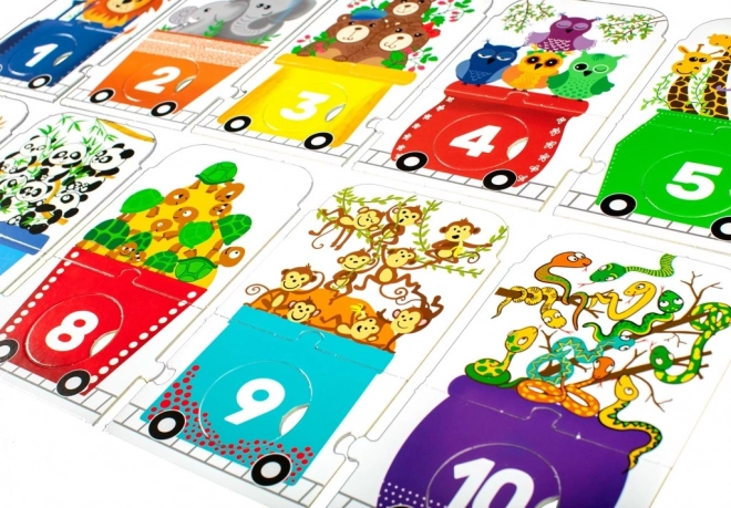 Puzzle-ul pentru copii în formă de tren reprezintă o provocare distractivă pentru micii exploratori. Este alcătuit dintr-o locomotivă și nouă vagoane, fiecare cu un număr diferit de animale: