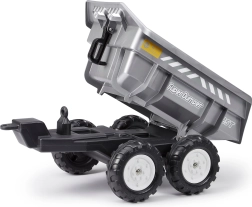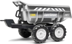 Remorcă „Super dumper” cu patru roți, de culoare gri. Compatibilă cu tractoarele Falk. Fabricată din plastic de calitate în Franța.