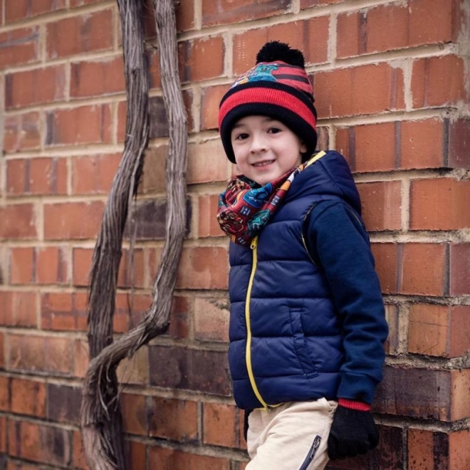 Căciulă tricotată în design roșu‑negru, cu stema vizibilă Hogwarts și ciucure moale, care menține capul și urechile la cald și oferă ținutei un stil fermecat.