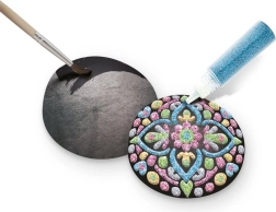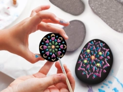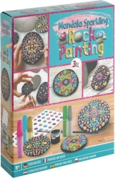 Cu acest set creativ, vei realiza cu ușurință modele de mandală spectaculoase și motive strălucitoare pe pietre netede. Datorită combinației de fundal negru, vopsele metalice și pietricele autocolante, decorațiunile tale vor ieși în evidență prin contrast și sclipire. Pictura pe pietricele este o modalitate excelentă de a te relaxa și, în același timp, de a crea cadouri frumoase sau accesorii pentru casă și grădină.