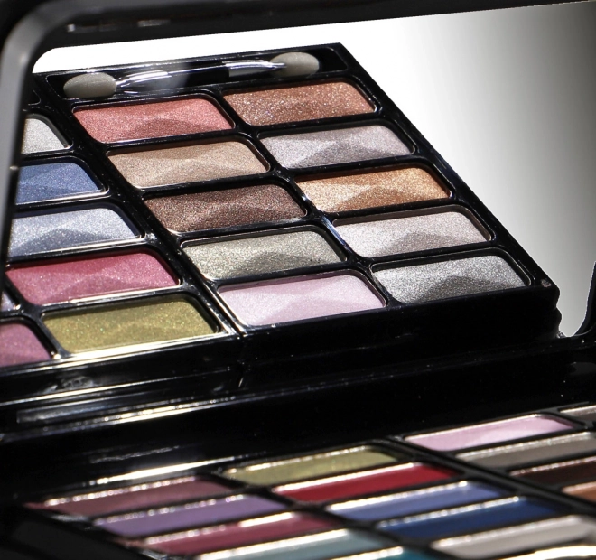 Carcasa neagră elegantă, cu oglindă, ascunde un set complet pentru machiajul ochilor, obrajilor și buzelor – ideală pentru călătorii și uz zilnic.