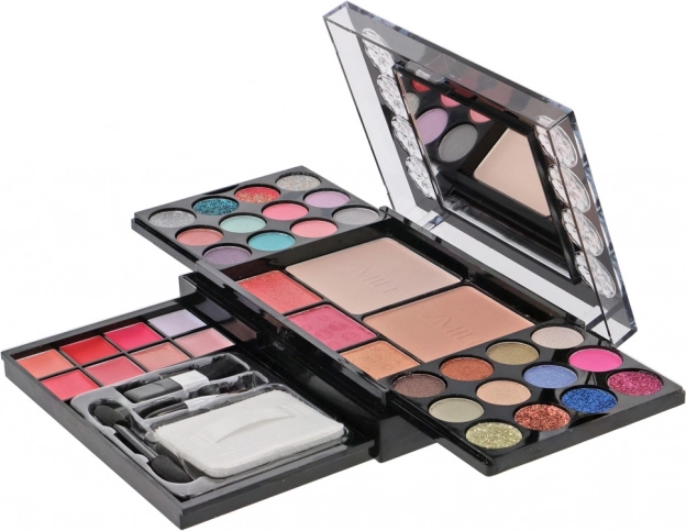 - 16× farduri de pleoape, 8× gloss cremos pentru buze, 8× cremă cu sclipici, 2× pudră, 1× aplicator/pensulă (3 în 1), oglindă integrată