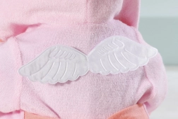 Lăsați-o pe Baby Annabell să trăiască momente magice cu acest halat și pijama stilat. Halatul este decorat cu aripi, care îl fac nu doar un accesoriu la modă, ci și un confortabil pentru joc. Sub halat, păpușa poartă un combinezon scurt cu imprimeu de oiță bucurându-se de un duș curcubeu. Pentru a menține piciorușele păpușii frumoase și calde, setul include și șosete roz cu imagini de aripi.