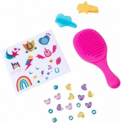 Pachetul include o gamă variată de accesorii precum un pieptene, clame și margele pentru posibilități nesfârșite de coafuri și decorare.