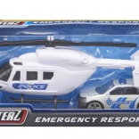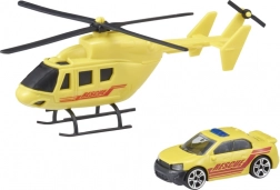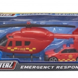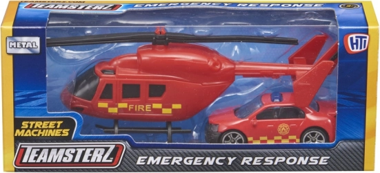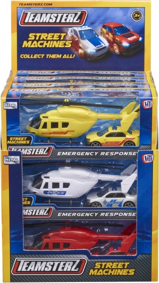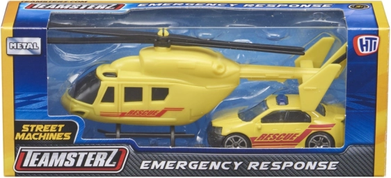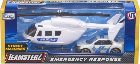 Setul TEAMSTERZ îmbină distracția cu durabilitatea: un elicopter detaliat, cu pale de rotor acționate manual, și o mașină de intervenție plină de acțiune, cu roți care se rotesc liber. Datorită șasiului metalic (turnat sub presiune) și pieselor din plastic de calitate, copiii se bucură de un joc realist de poliție, pompieri și salvatori.