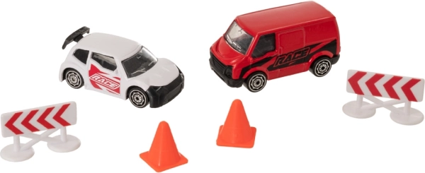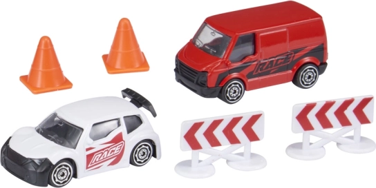 Setul conține o mașinuță de curse, un camion de asistență și accesorii rutiere (2 conuri, 2 bariere), astfel încât copiii pot construi imediat trasee și pot începe cursele.