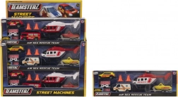 Pregătește-te pentru propriile misiuni de salvare pe uscat și pe apă cu setul Teamsterz! Găsești înăuntru un elicopter turnat din metal, cu pale rotite manual, un vehicul de intervenție, un 4×4 cu dispozitiv de tractare, o barcă cu remorcă și accesorii de urgență. Caroseria turnată sub presiune și roțile cu rulare liberă asigură ore întregi de distracție creativă pentru copii de la 3 ani.