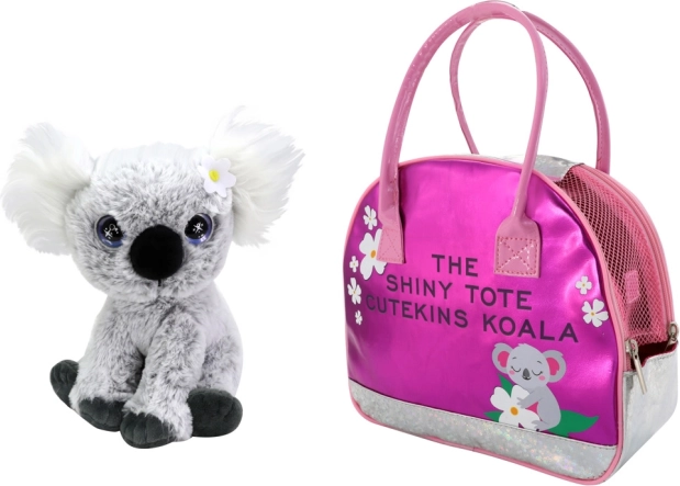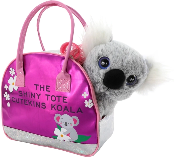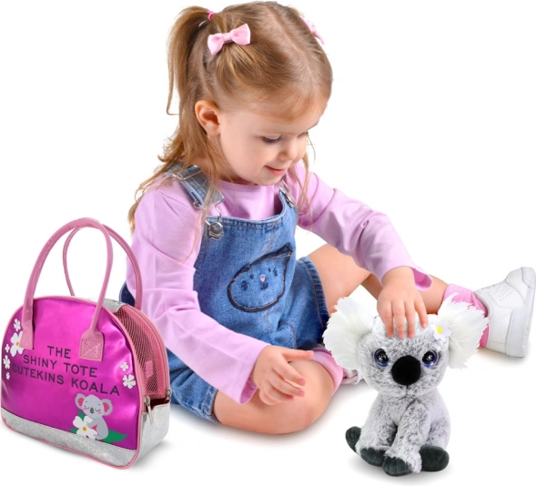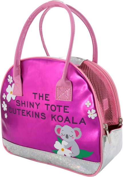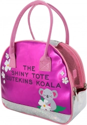 Geanta lucioasă roz, cu motiv de koală, permite transportul comod al jucăriei și completează orice ținută de copil.