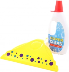 Set de curățenie pentru micile gospodine conține – făraș, perie de mână, racletă pentru geamuri, bureți și detergent.