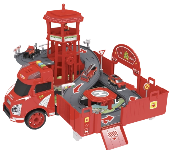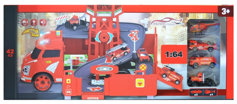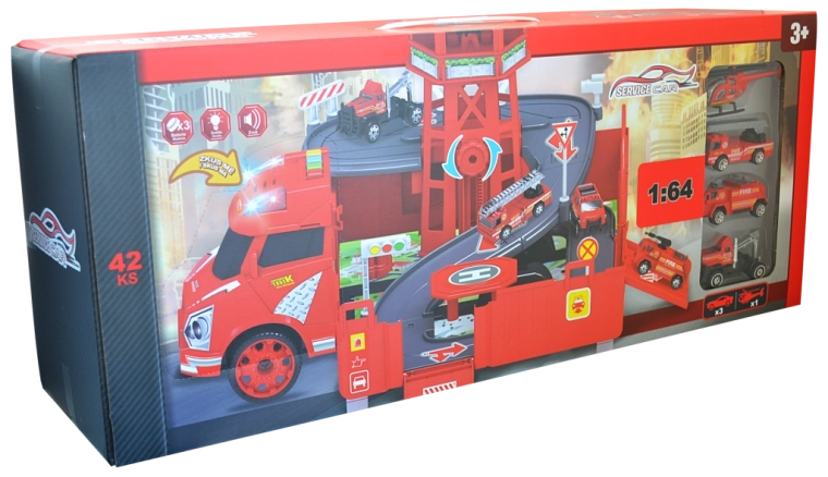 Stație de pompieri garaj cu accesorii (set). Dimensiunea garajului după asamblare: 46,5 × 49 × 29 cm, butoane pentru efecte sonore și luminoase, rulare în gol, funcția „ÎNCEARCĂ-MĂ”. Activarea funcției ÎNCEARCĂ-MĂ: Scoateți siguranța din compartimentul bateriilor, pe care o găsiți pe cabina mașinii, și testați funcțiile apăsând butoanele amplasate pe acoperișul cabinei. Conținutul setului: mașină de pompieri/garaj 2 în 1 (funcție de transformare din mașină în garaj și invers), model metalic de mașinuță la scara 1:64 (6 buc.) și elicopter.