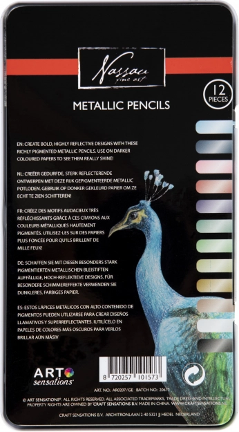 Descoperă creativitatea cu creioanele metalice Nassau – set de 12 culori cu luciu pronunțat, care ies cel mai bine în evidență pe hârtie închisă la culoare. Datorită pigmentării bogate, efectului metalic și lemnului de calitate, sunt ideale pentru copii de la 6 ani și pentru adulți creativi. Cutia metalică practică protejează creioanele și ușurează transportul.