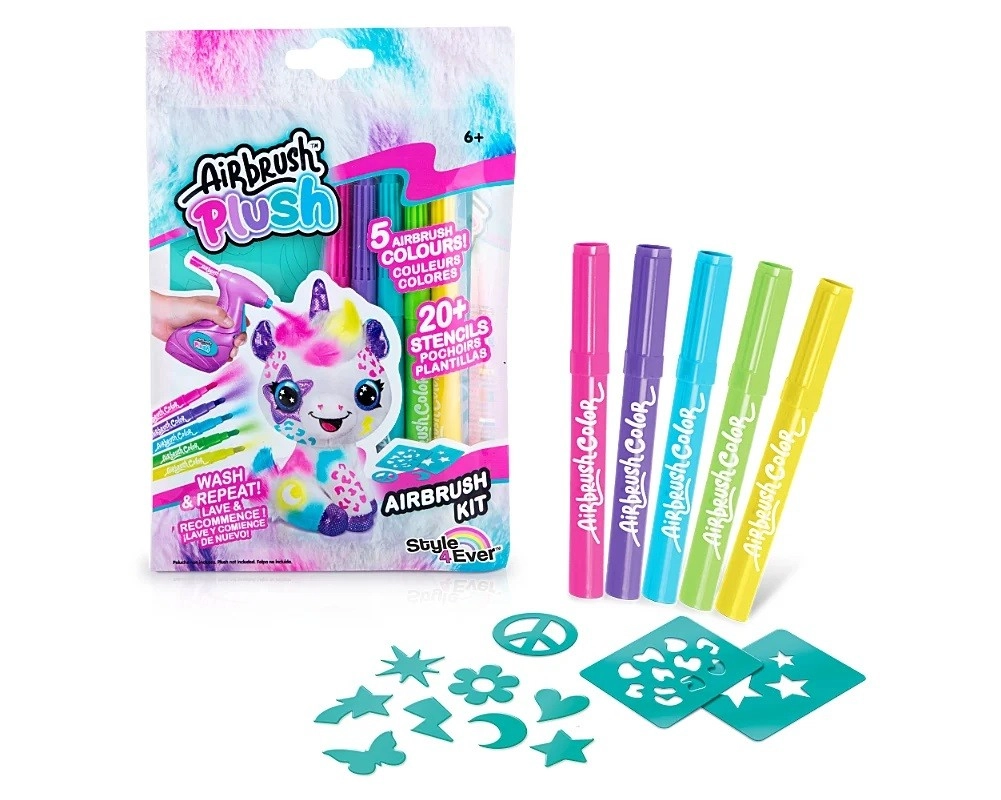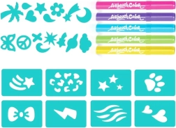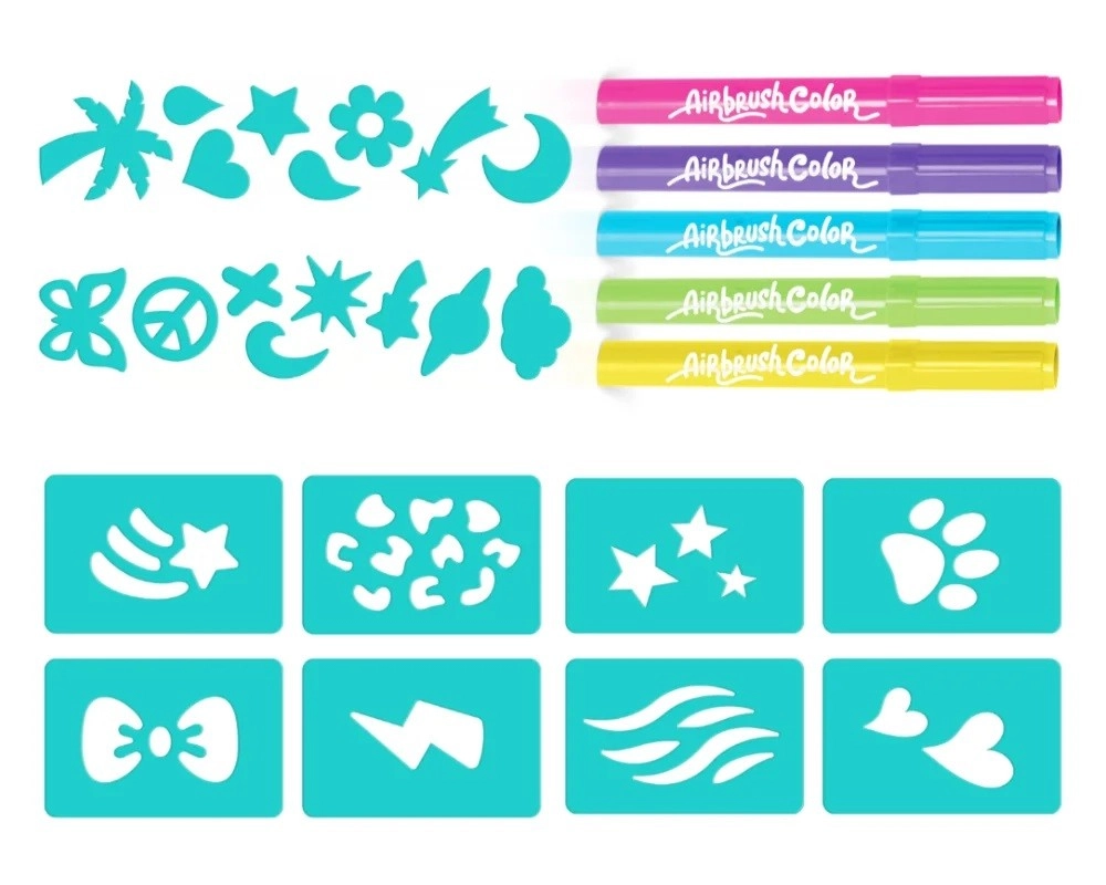 Completează-ți setul creativ cu rezerve practice pentru aerograf. Pachetul conține 5 culori intense și 20 de șabloane pentru creații ușoare și distractive. Ideal pentru copii de la 6 ani care adoră să deseneze și să descopere tehnici noi.