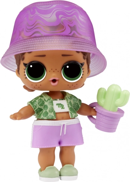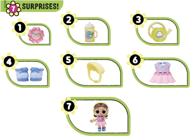 Păpușa vine cu 7 surprize, inclusiv accesorii colecționabile precum o sticlă, o cană și altele.