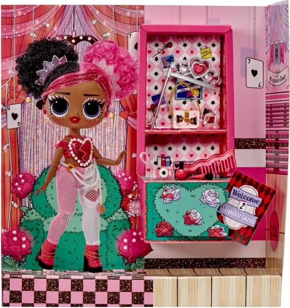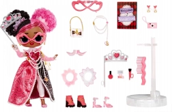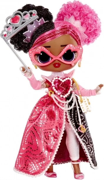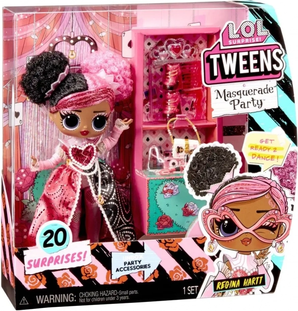 Păpușa L.O.L. Surprise Tweens Regina Hartt vine într-un stil roz-negru puternic, cu perle, inimioare și detalii strălucitoare. Este pregătită să strălucească la balul mascat și va încânta toate iubitoarele de accesorii, costume și styling.