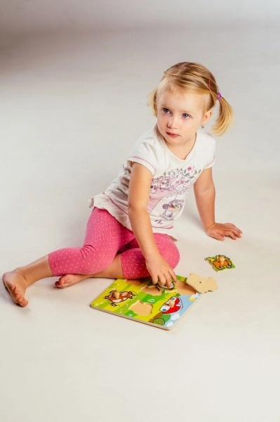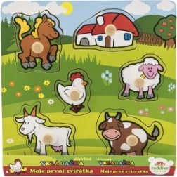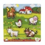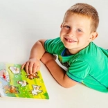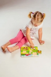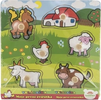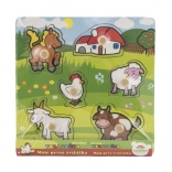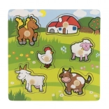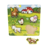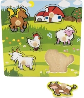 Acest puzzle conține în total 5 animale colorate, inclusiv un căluț, o capră, o oaie, o găină și o vacă, care sunt ușor de prins datorită micilor mânere de lemn. Fiecare piesă are locul său pe un suport de lemn, ceea ce ajută copiii să învețe să plaseze corect fiecare piesă.