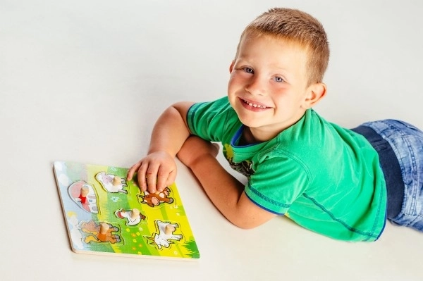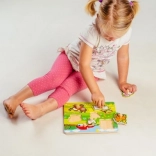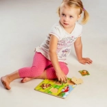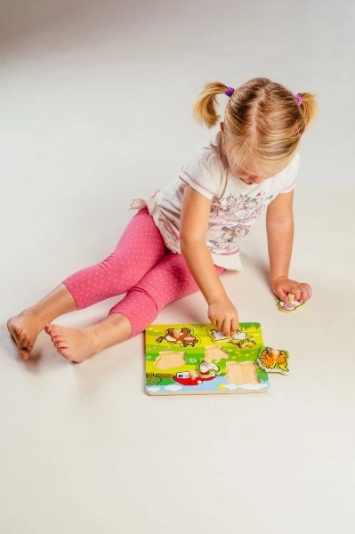 Fiecare piesă de puzzle are un mic mâner de lemn, datorită căruia copiii își pot exersa cu ușurință prinderea și plasarea pieselor la locul potrivit.