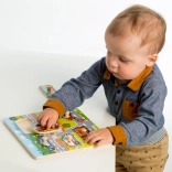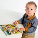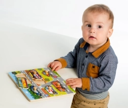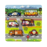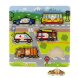 Fiecare dintre cele șase imagini puzzle reprezintă un alt mijloc de transport: mașina poliției, autobuzul, ambulanța, camionul de pompieri, mașina de gunoi și mașină personală. Asamblarea este ușoară datorită plăcii de lemn și mânerelor care facilitează manipularea pieselor de către mânuțele mici.