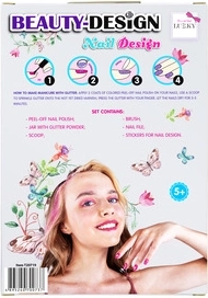 - 1× ojă peel-off, 1× stickere pentru unghii, 1× cutiuță cu sclipici, 1× pensulă, 1× pilă pentru unghii, 1× linguriță