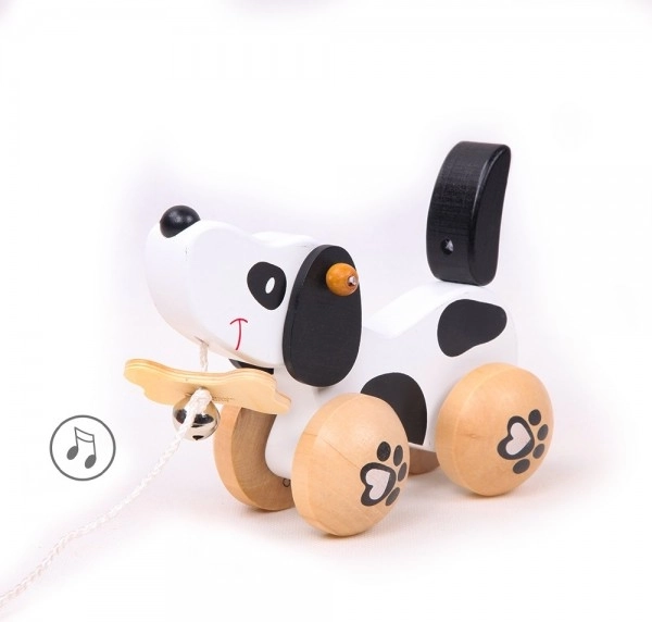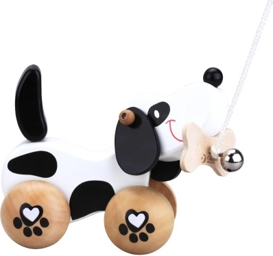 Căţelul este pe roți cu motiv de lăbuțe, iar coada lui se mișcă la deplasare, ceea ce îi adaugă la jucaus. Distracția este accentuată de clopoțel, care stimulează percepția auditivă a copiilor. Este echipat cu o sfoară care este atașată de un os în gură, permițând tractarea ușoară. Jucăria este potrivită atât pentru joacă în casă, cât și afară.