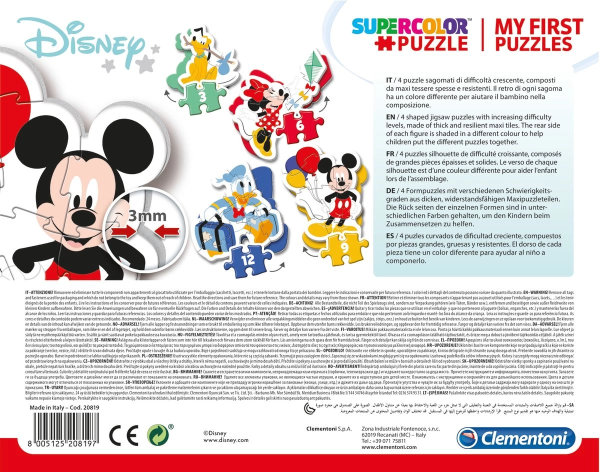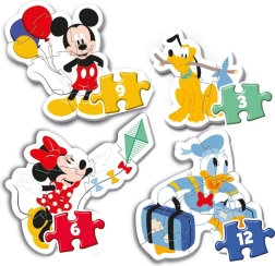 Patru puzzle-uri colorate cu motivul MICKEY MOUSE pentru cei mai mici oferă asamblare progresivă cu 3, 6, 9 și 12 piese. Piese mari și rezistente cu grosime de aproximativ 3 mm sunt ușor de prins de mâinile mici, susțin îndemânarea manuală, coordonarea mână–ochi și orientarea spațială. Ideal de la 2 ani.