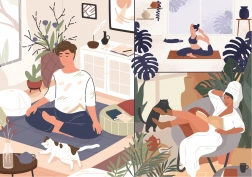 Temele de yoga, odihnă și pisici aduc o atmosferă liniștită, ideală pentru relaxare de seară și pentru asamblare împreună cu familia.