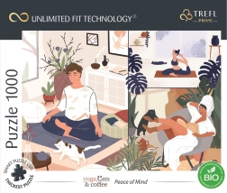 Bucurați-vă de calm și relaxare cu puzzle-ul TREFL din colecția UFT, cu temă de yoga, pisici și cafea. Datorită Unlimited Fit Technology puteți îmbina cu ușurință mai multe imagini într-un singur colaj mare. Acest puzzle de 1000 de piese oferă forme inteligente ale pieselor, carton gros pentru durabilitate îndelungată și ambalaj bio fără plastic inutil.
