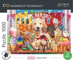 Trefl Unlimited Fit Technology (UFT) aduce o nouă dimensiune asamblării: motivele individuale din serie pot fi conectate liber pentru a crea colaje puzzle mari fără limitări. Motivul cu căței drăgălași în fața cofetăriei îi va încânta pe iubitorii de animale și de design de calitate.