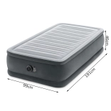 Pompa electrică integrată umflă și dezumflă salteaua în câteva minute – fără efort, curat și rapid. PVC-ul durabil, cu suprafață din velur rezistentă la apă, suportă utilizarea zilnică, iar capacitatea maximă este de 136 kg. Este inclusă o geantă de transport pentru depozitare și manipulare ușoară.