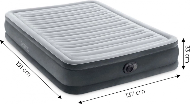 Pat gonflabil practic pentru două persoane, cu dimensiunile 191 × 137 × 33 cm și pompă electrică integrată pentru umflare și dezumflare rapidă. Oferă susținere fermă a coloanei datorită tehnologiilor Fiber-Tech și Dura-Beam, este realizată din PVC rezistent cu suprafață din velur plăcută la atingere, suportă până la 272 kg și include geantă de transport și petic de reparare.
